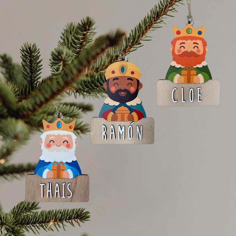 Añade magia al árbol con nuestro adorno de Navidad personalizado en forma de Rey Melchor. Fabricado en madera con impresión de alta definición, este simpático rey navideño incluye un kit de letras personalizable para que escribas el nombre que quieras (peque, pareja, familia o mascota). Es ligero, resistente y llega listo para colgar con su cuerda.
