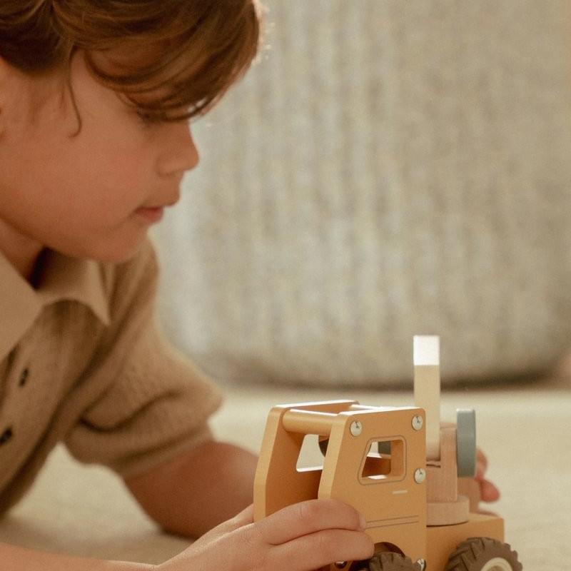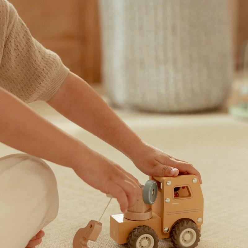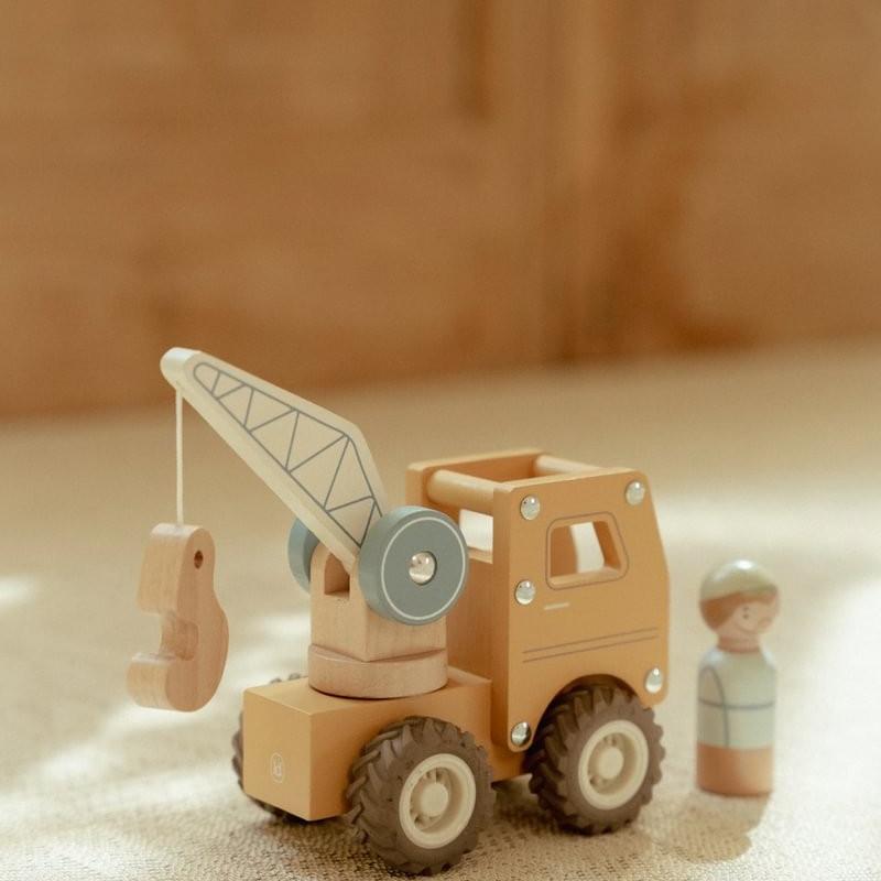 El camión grúa de madera tiene un brazo giratorio e incluye una persona trabajadora de la construcción.