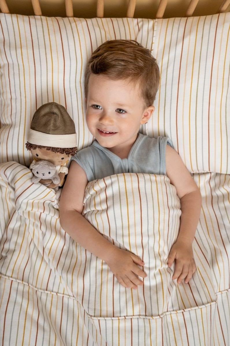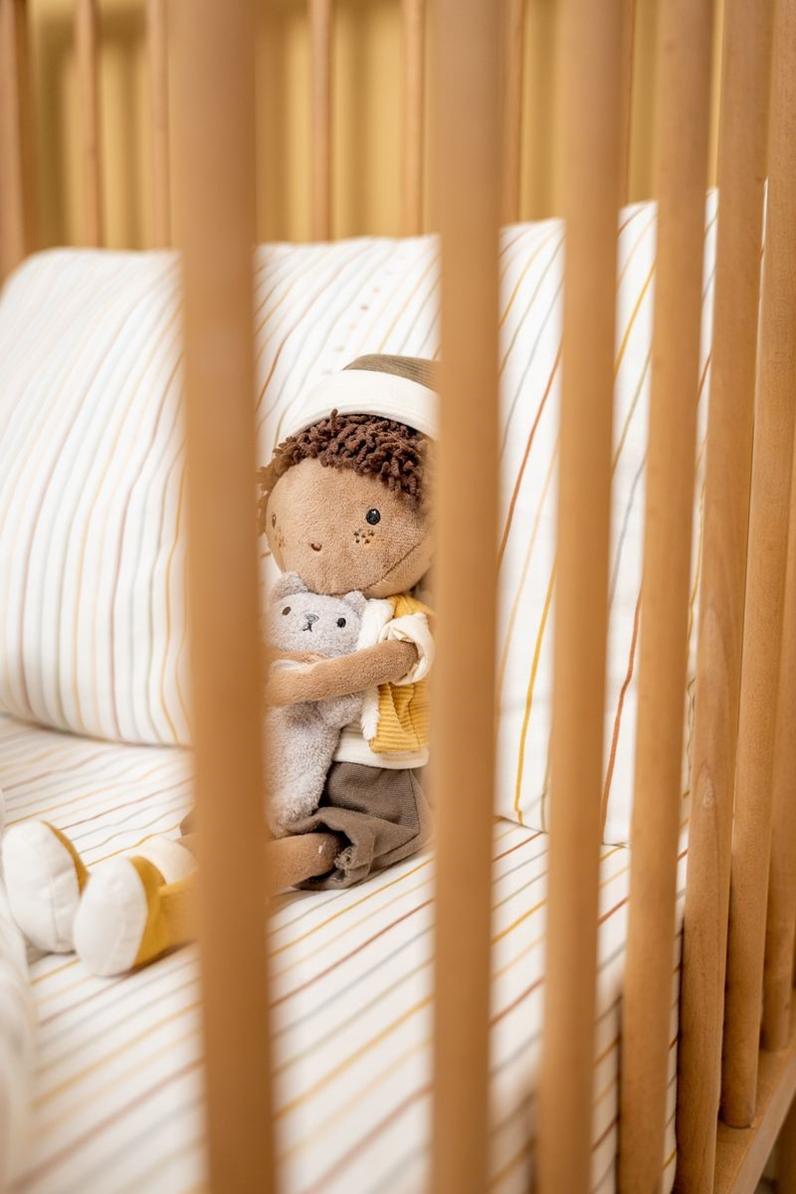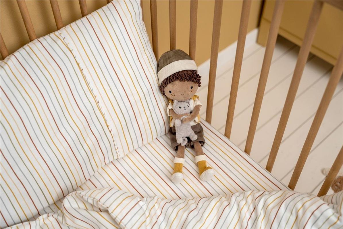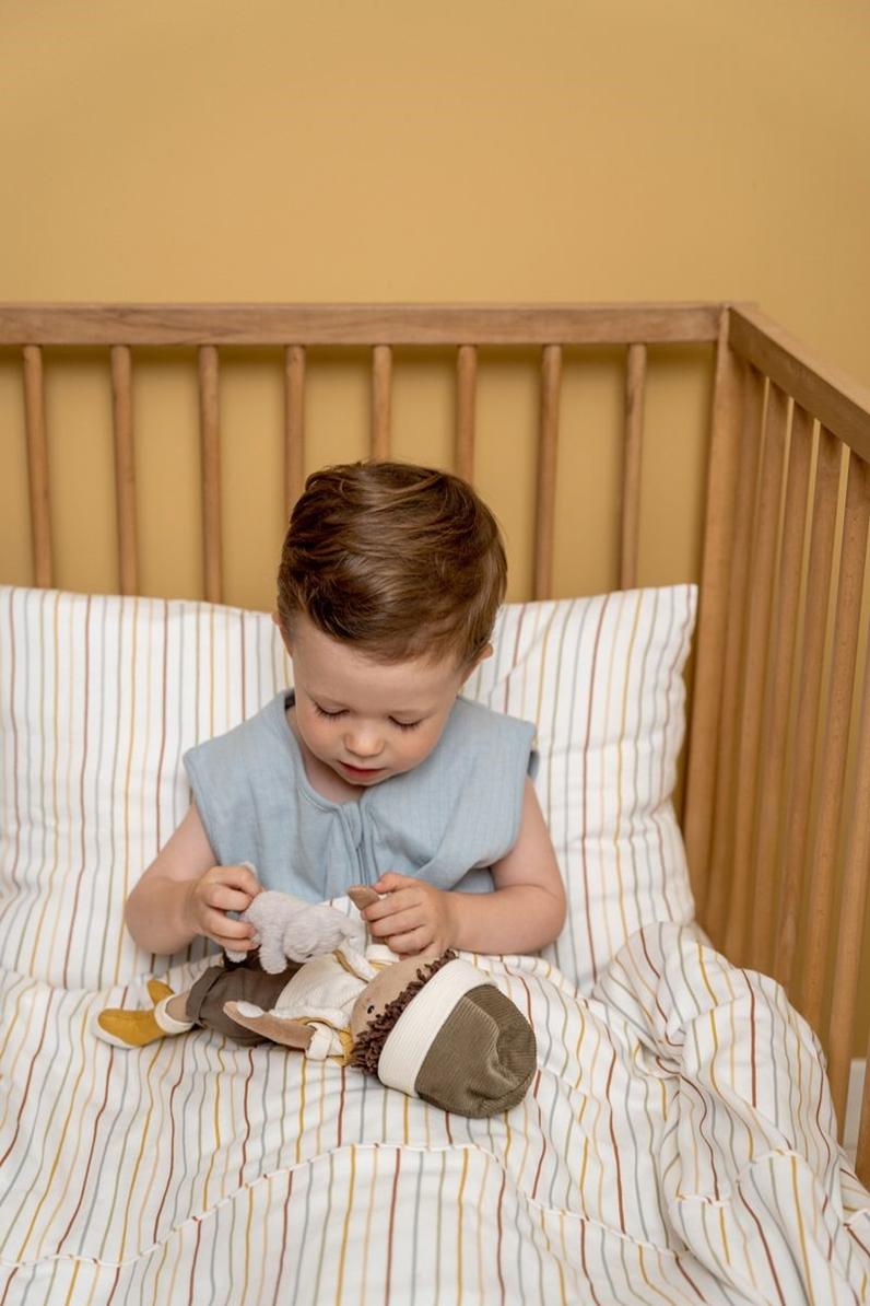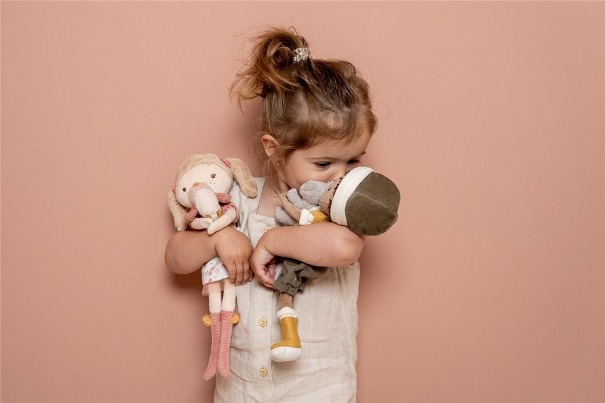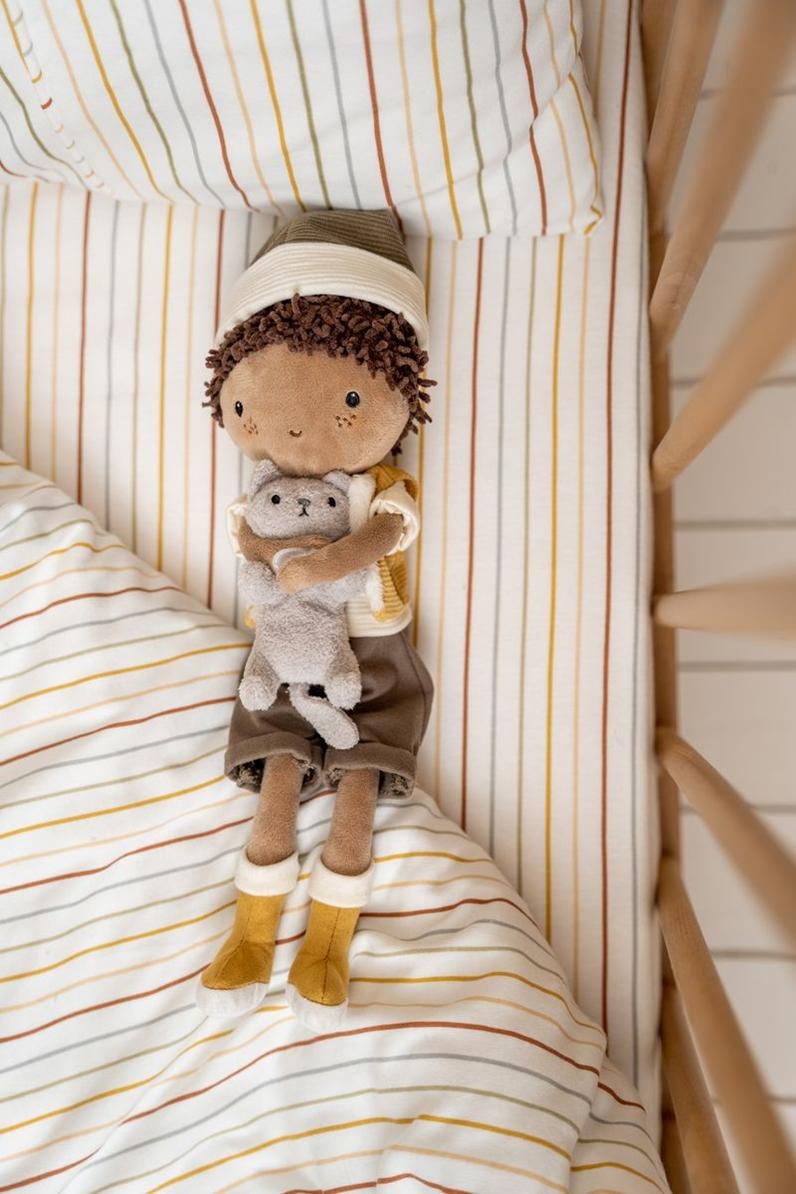 Este muñeco blandito con su gorro y sus botas de agua amarillas, viene con un precioso gato gris en sus brazos.