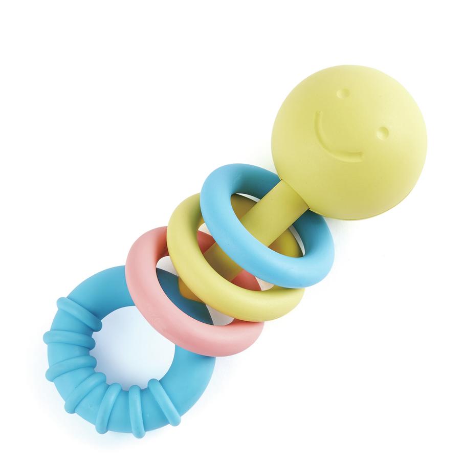 Dispone de 3 anillos de color azul, amarillo y rosa para que pueda moverlos de un lado a otro. En uno de los extremos hay una bolita con una carita feliz y, en el otro una anilla azul.
