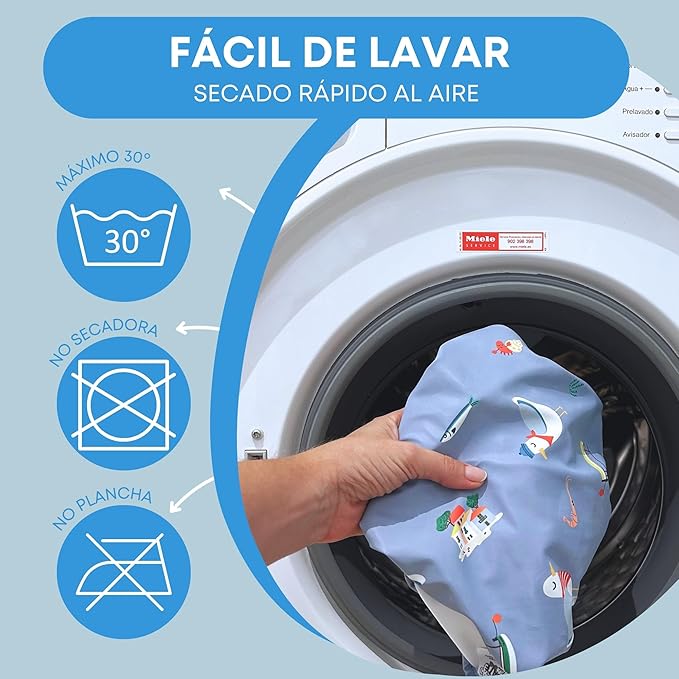 Llévatelo donde quieras gracias a la posibilidad de plegarlo fácilmente dentro del bolsillo de doble forro y prueba de utilizarlo en las comidas dentro y fuera de casa, o como delantal o bata impermeable para pintar y hacer manualidades.