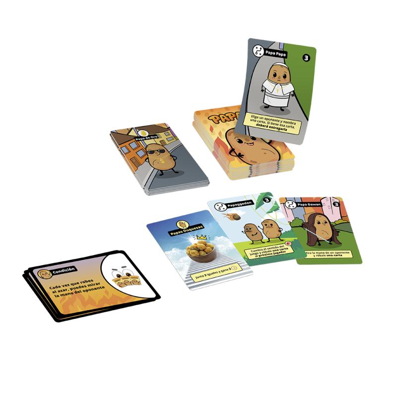 Papas es un entretenido juego de cartas familiar, en el cual tendrás que juntar la mayor cantidad de Papas de Oro. Para esto tendrás que jugar papas para atacar o defenderte.